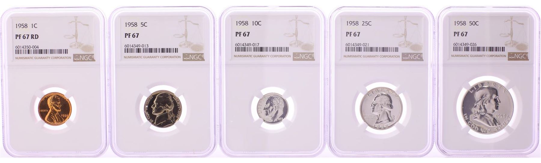 One 1958 (5) Coin Proof Set Graded NGC PF67. NGC Certified.