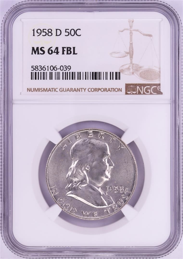 One 1958-D Franklin Half Dollar Coin NGC MS64FBL. NGC Certified.