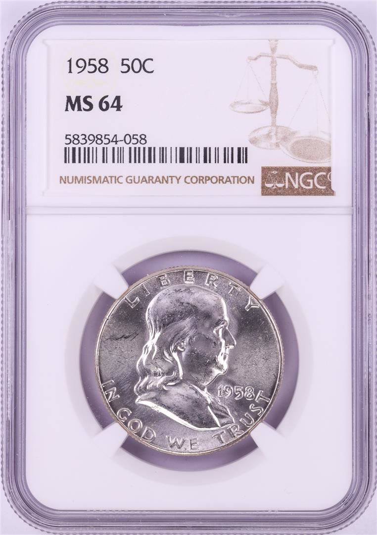 One 1958 Franklin Half Dollar Coin NGC MS64. NGC Certified.