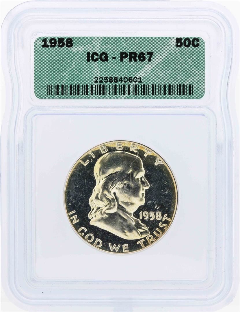 One 1958 Franklin Half Dollar Proof Coin ICG PR67. ICG Certified.