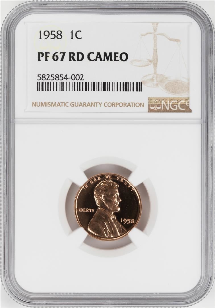 One 1958 Proof Lincoln Wheat Cent Coin NGC PF67RD Cameo. NGC Certified.