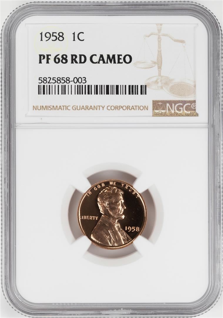 One 1958 Proof Lincoln Wheat Cent Coin NGC PF68RD Cameo. NGC Certified.