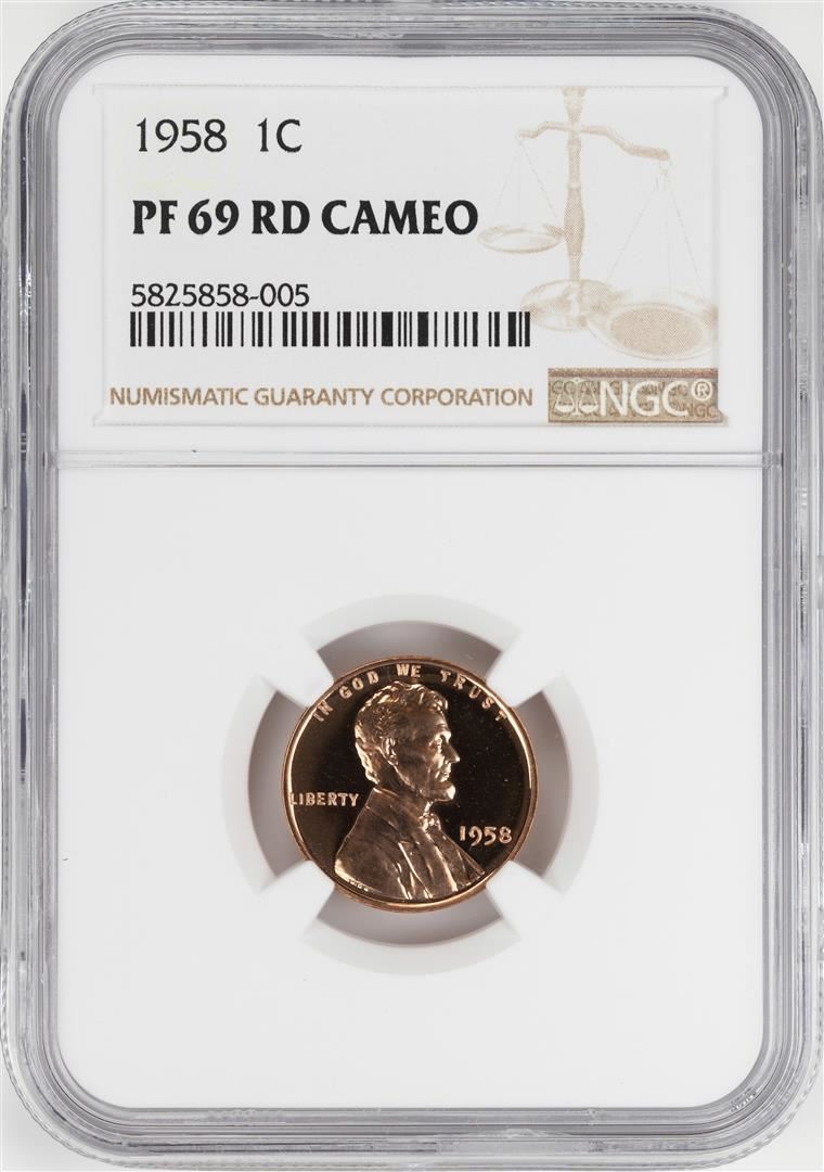 One 1958 Proof Lincoln Wheat Cent Coin NGC PF69RD Cameo Graded Top Pop. NGC Certified.