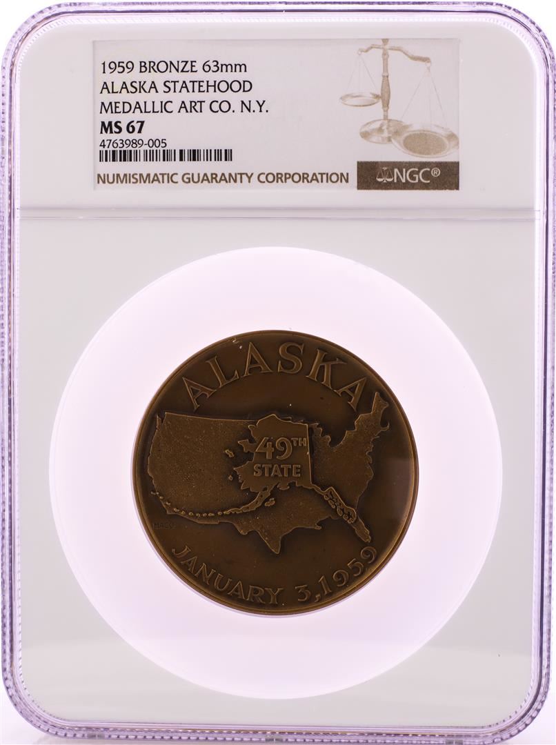 One 1959 Alaska Statehood Medallic Art Co. N.Y Bronze 63mm Medal NGC MS67. NGC Certified.