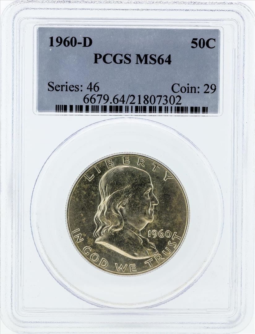 One 1959-D Franklin Silver Half Dollar Coin NGC MS64. PCGS Graded.