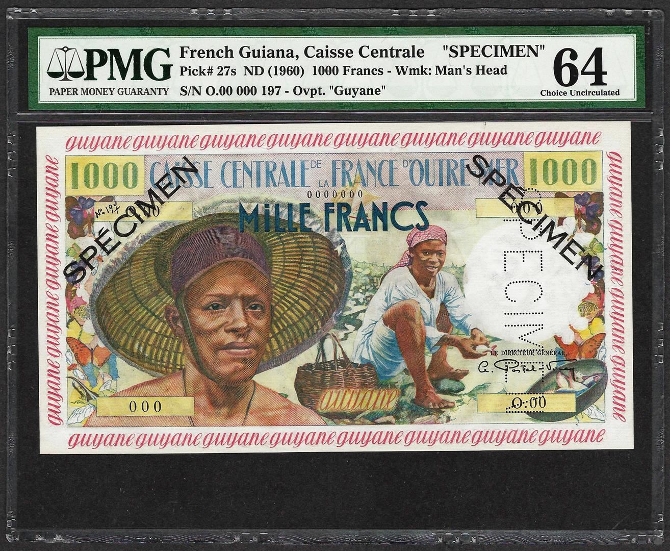 One 1960 French Guiana Caisse Centrale 1000 Francs Specimen Note PMG Choice Uncirculated 64. PMG Certified.