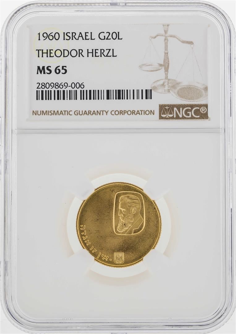 One 1960 Israel 20 Lirot Theodor Herzl Gold Coin NGC MS65. NGC Certified.