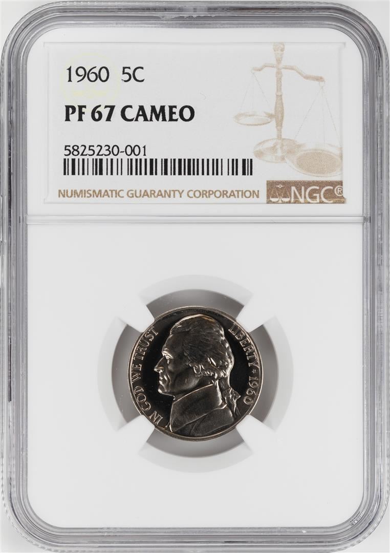 One 1960 Proof Jefferson Nickel Coin NGC PF67 Cameo. NGC Certified.