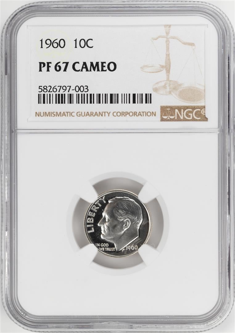 One 1960 Proof Roosevelt Dime Coin NGC PF67 Cameo. NGC Certified.