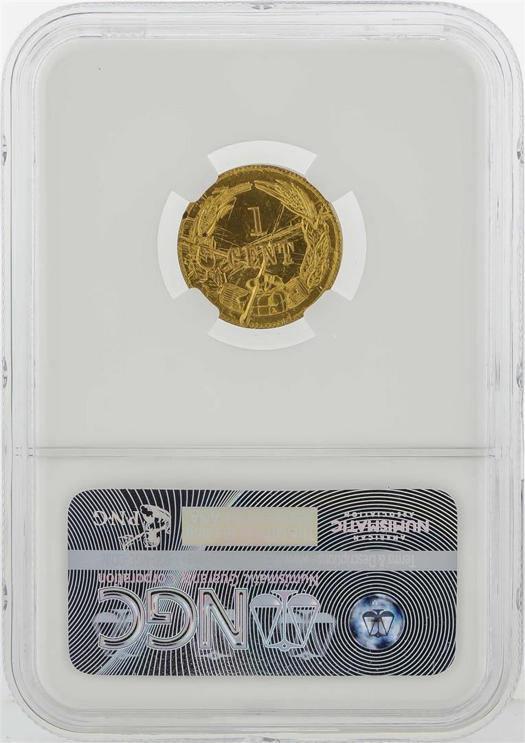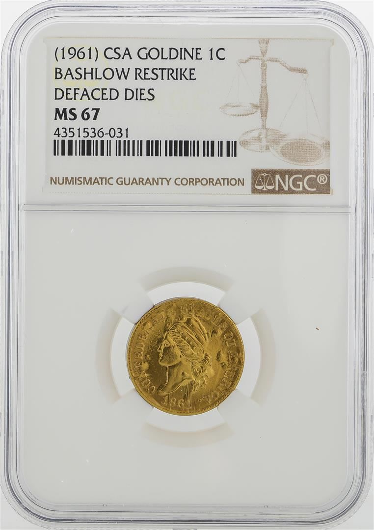 One 1961 CSA 1 Cent Goldine Coin Bashlow Restrike NGC MS67. NGC Certified.
