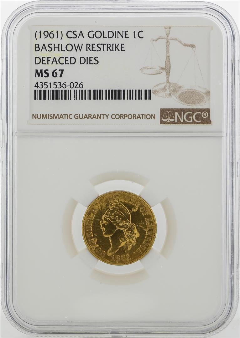 One 1961 CSA 1 Cent Goldine Coin Bashlow Restrike NGC MS67. NGC Certified.