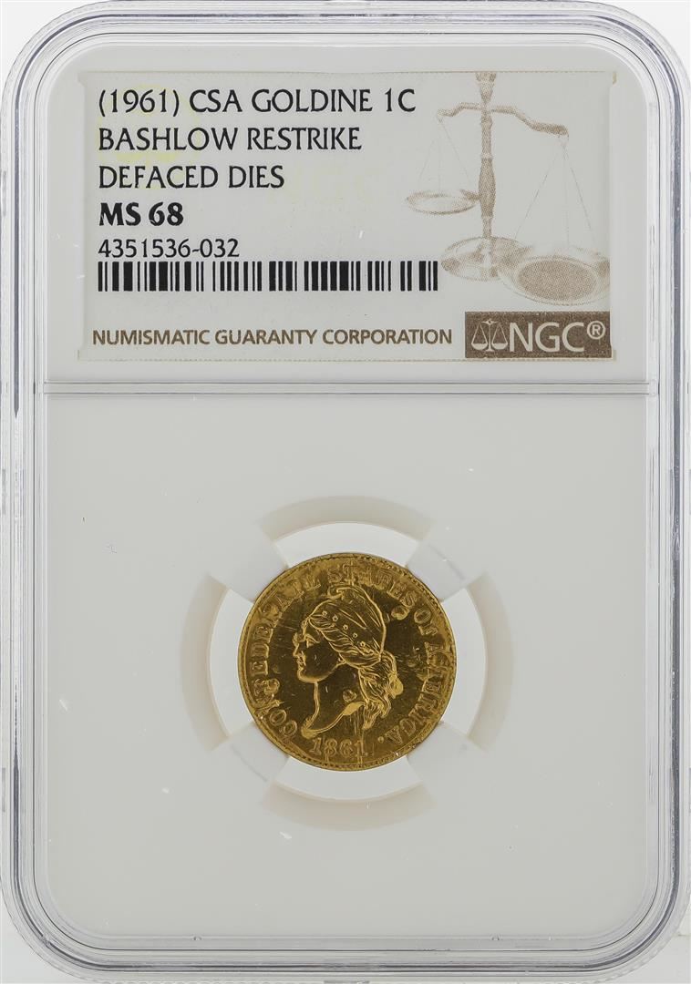 One 1961 CSA 1 Cent Goldine Coin Bashlow Restrike NGC MS68. NGC Certified.