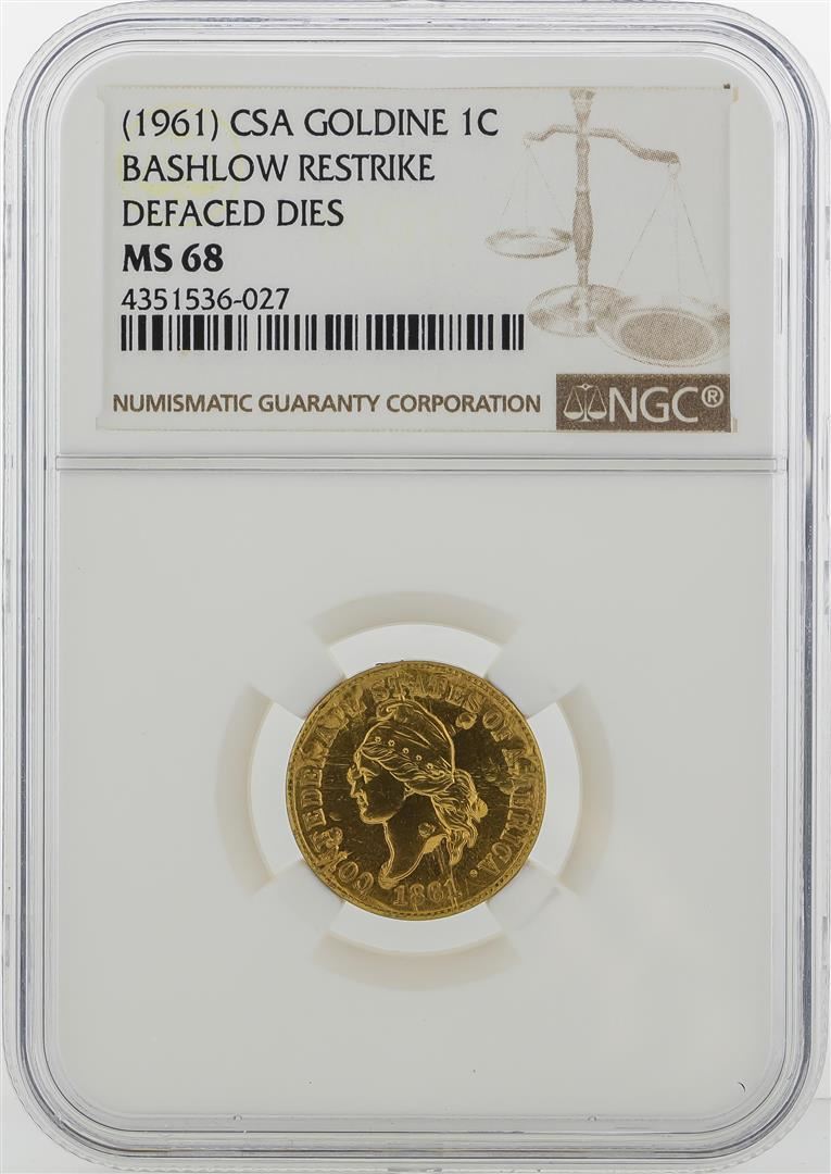 One 1961 CSA 1 Cent Goldine Coin Bashlow Restrike NGC MS68. NGC Certified.