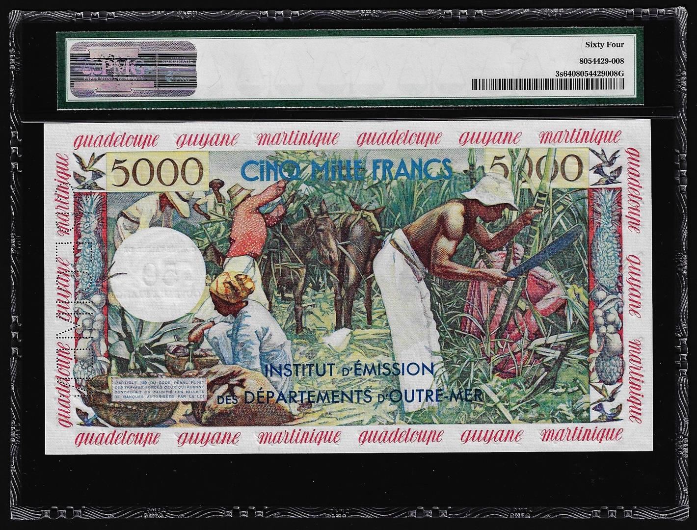 One 1961 French Antilles 50 Nouveaux Francs on 5000 Francs Specimen Note PMG Choice Unc. 64. PMG Certified.