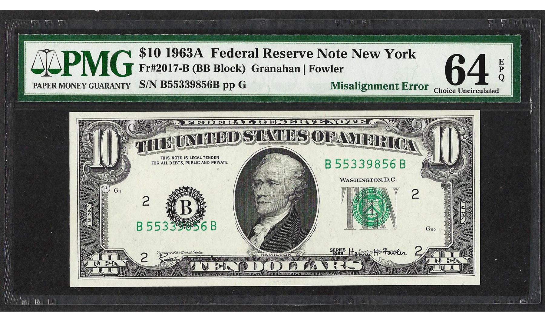 One 1963 $10 Federal Reserve Note ERROR Misalignment PMG Choice Uncirculated 64EPQ. PMG Certified.