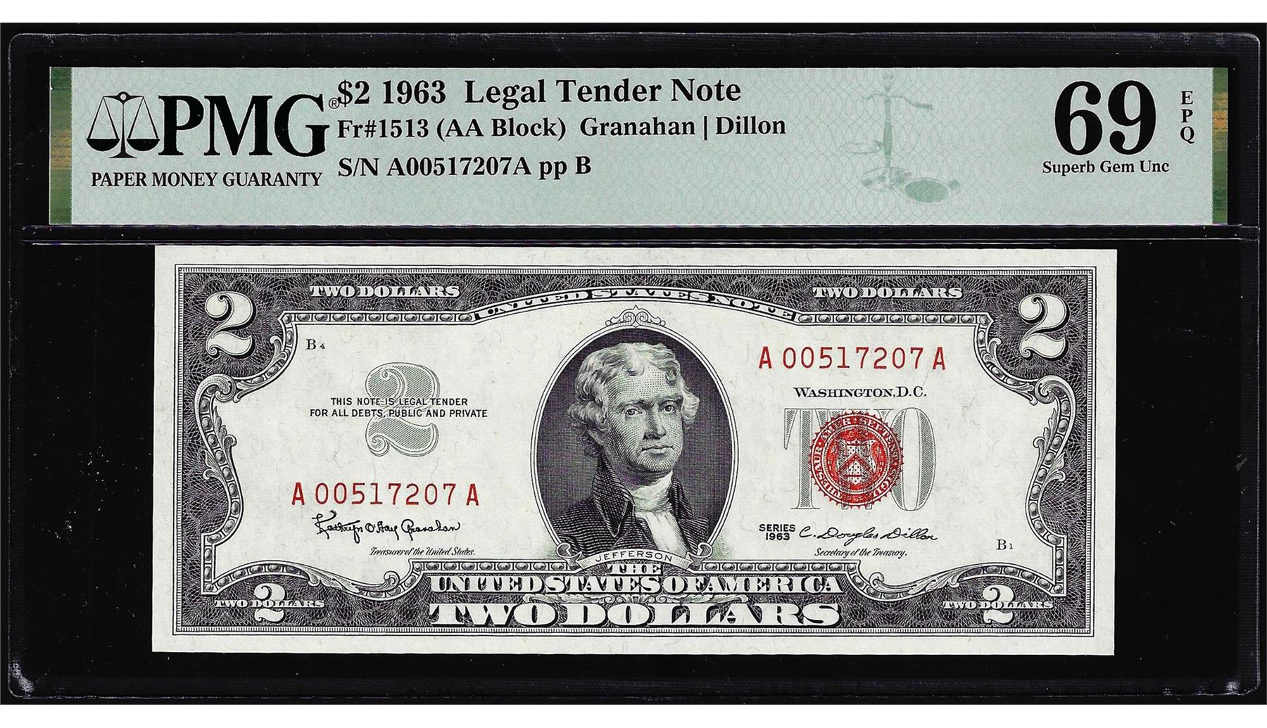 One 1963 $2 Legal Tender Note Fr.1513 PMG Superb Gem Uncirculated 69EPQ. PMG Certified.