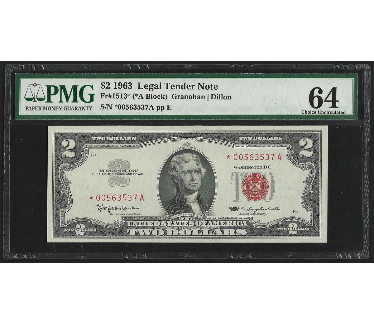 One 1963 $2 Legal Tender Note STAR PMG Choice Uncirculated 64. PMG Certified.