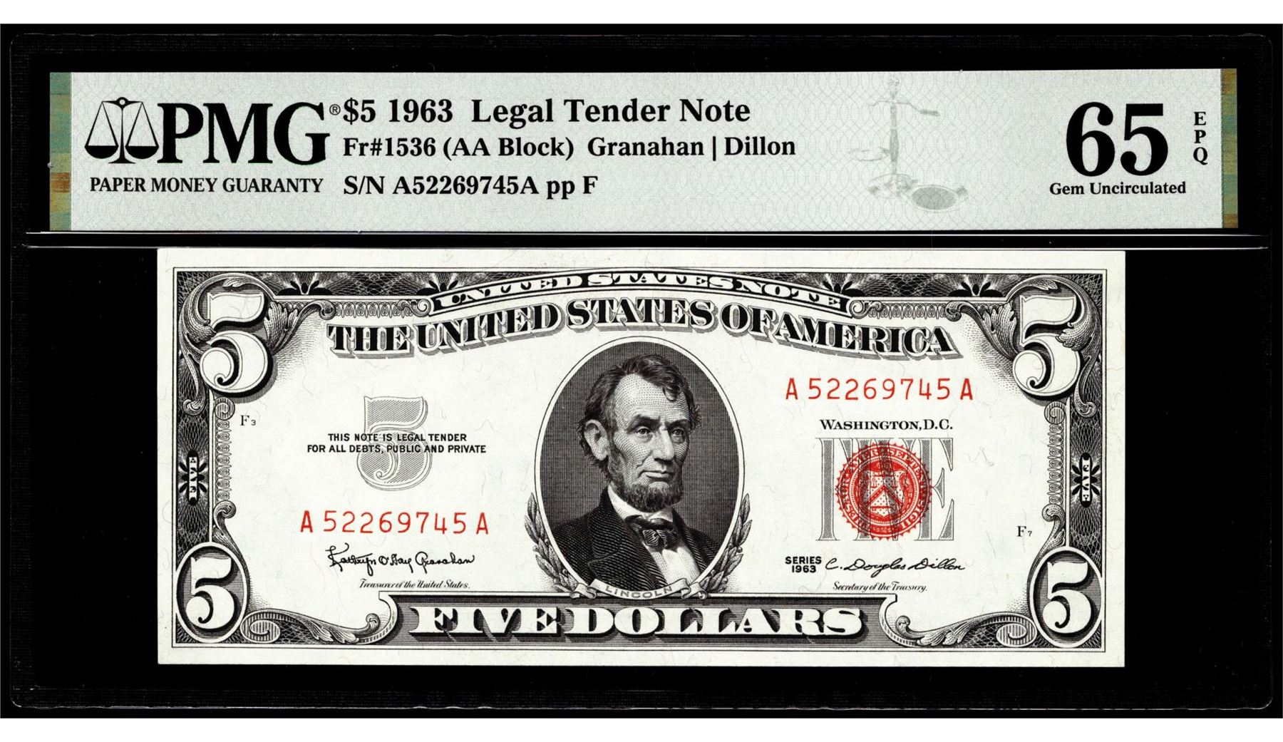 One 1963 $5 Legal Tender Note Fr.1536 PMG Gem Uncirculated 65EPQ. PMG Certified.