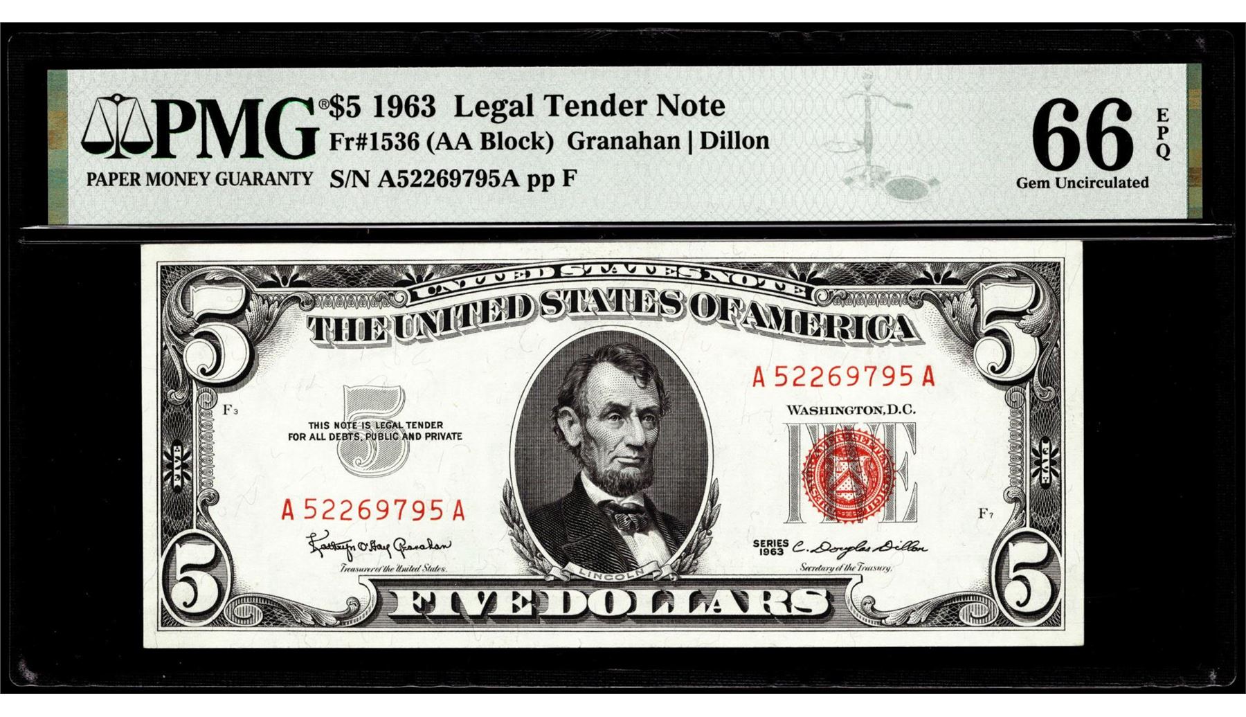 One 1963 $5 Legal Tender Note Fr.1536 PMG Gem Uncirculated 66EPQ. PMG Certified.