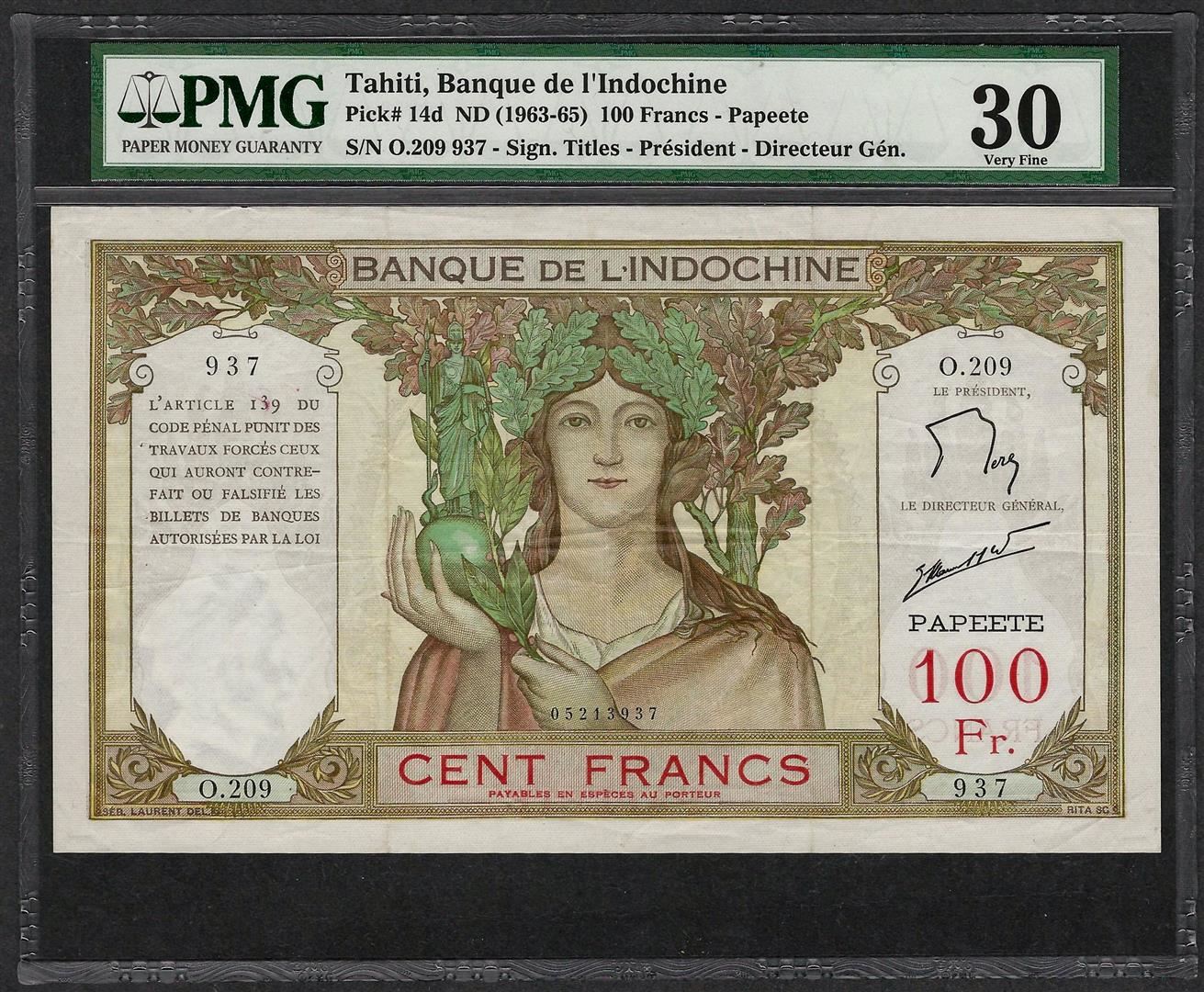 One 1963-65 Banque de l'Indochine Tahiti 100 Francs Note Pick# 14d PMG Very Fine 30. PMG Certified.
