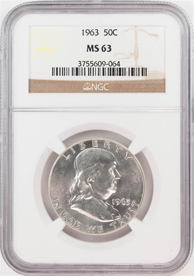 One 1963 Franklin Half Dollar Coin NGC MS63. NGC Certified.