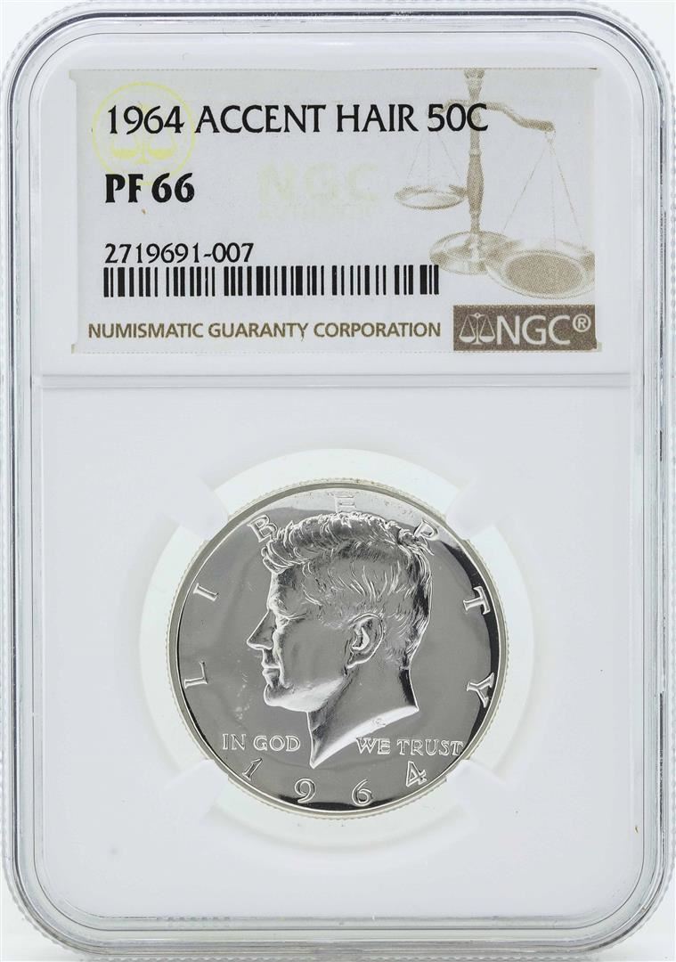 One 1964 Accent Hair Kennedy Half Dollar Silver Proof Coin NGC PF66. NGC Certified.