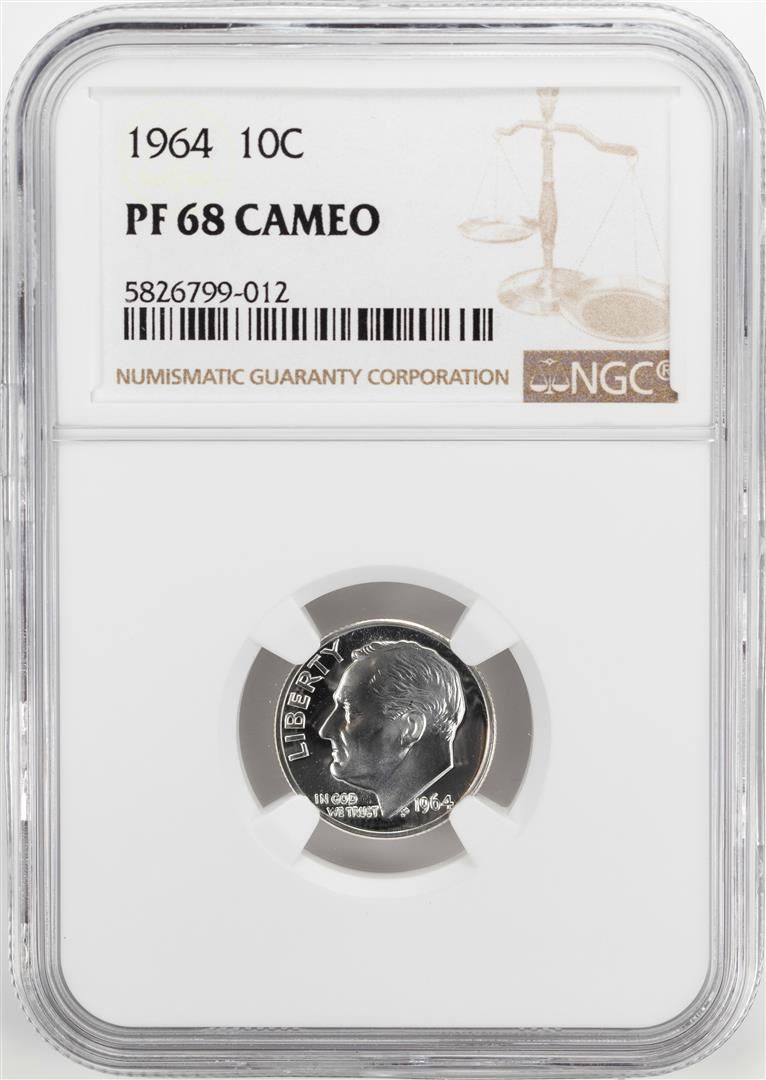 One 1964 Proof Roosevelt Dime Coin NGC PF68 Cameo. NGC Certified.