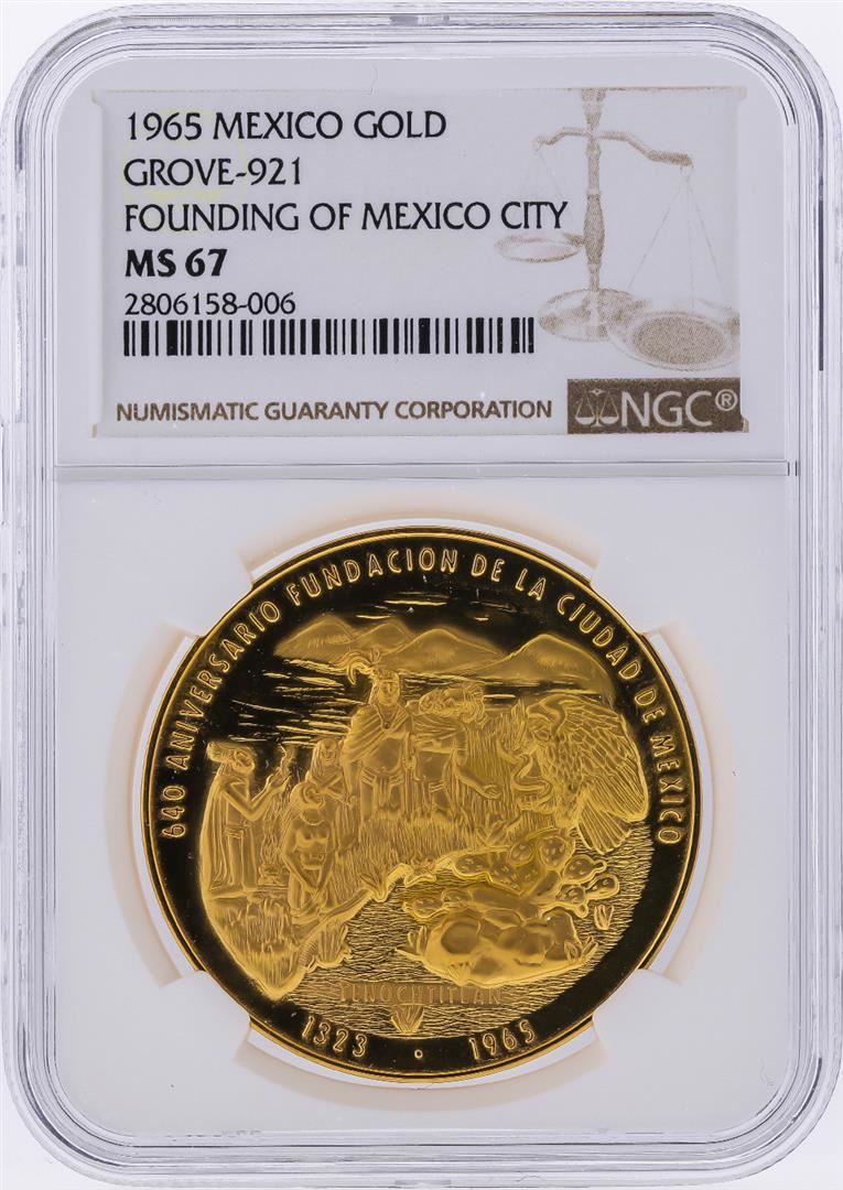 One 1965 Mexico Gold Grove-921 Founding of Mexico City NGC MS67. NGC Certified.