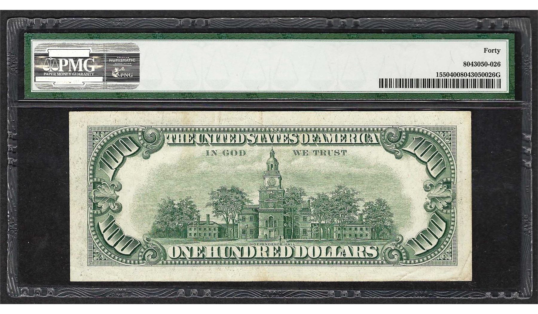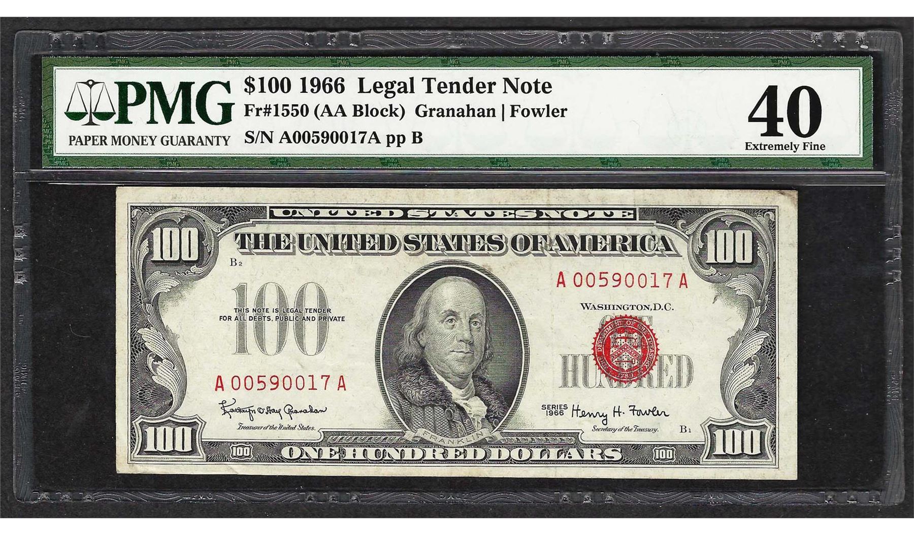 One 1966 $100 Legal Tender Note Fr.1550 PMG Extremely Fine 40. PMG Certified.
