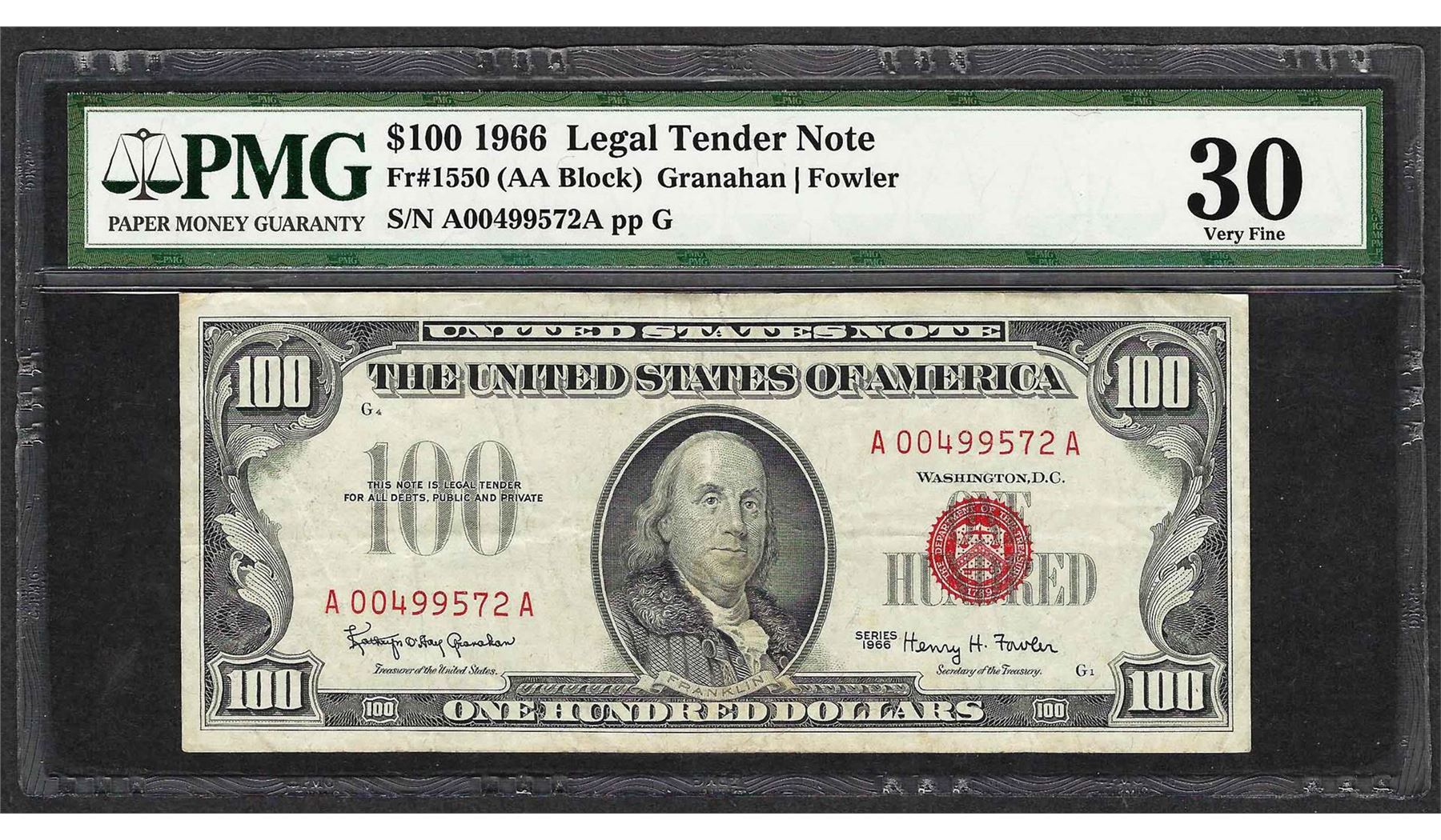 One 1966 $100 Legal Tender Note Fr.1550 PMG Very Fine 30. PMG Certified.