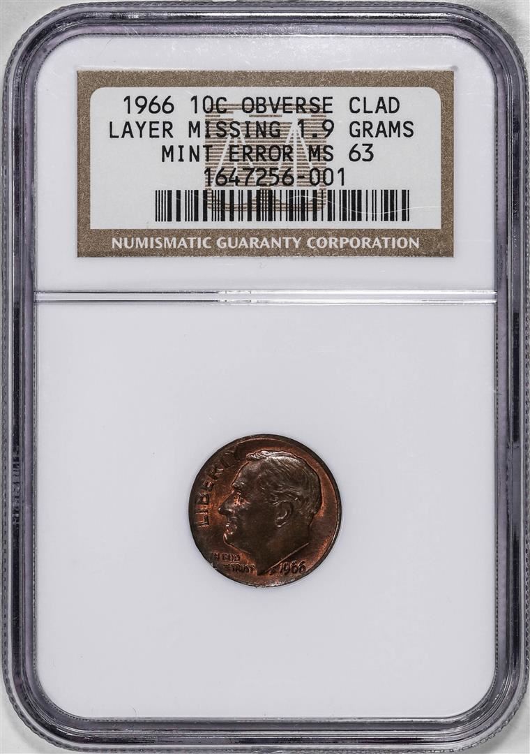 One 1966 Roosevelt Dime Mint Coin ERROR Obverse Clad Layer Missing 1.9 Grams NGC MS63. NGC Certified.