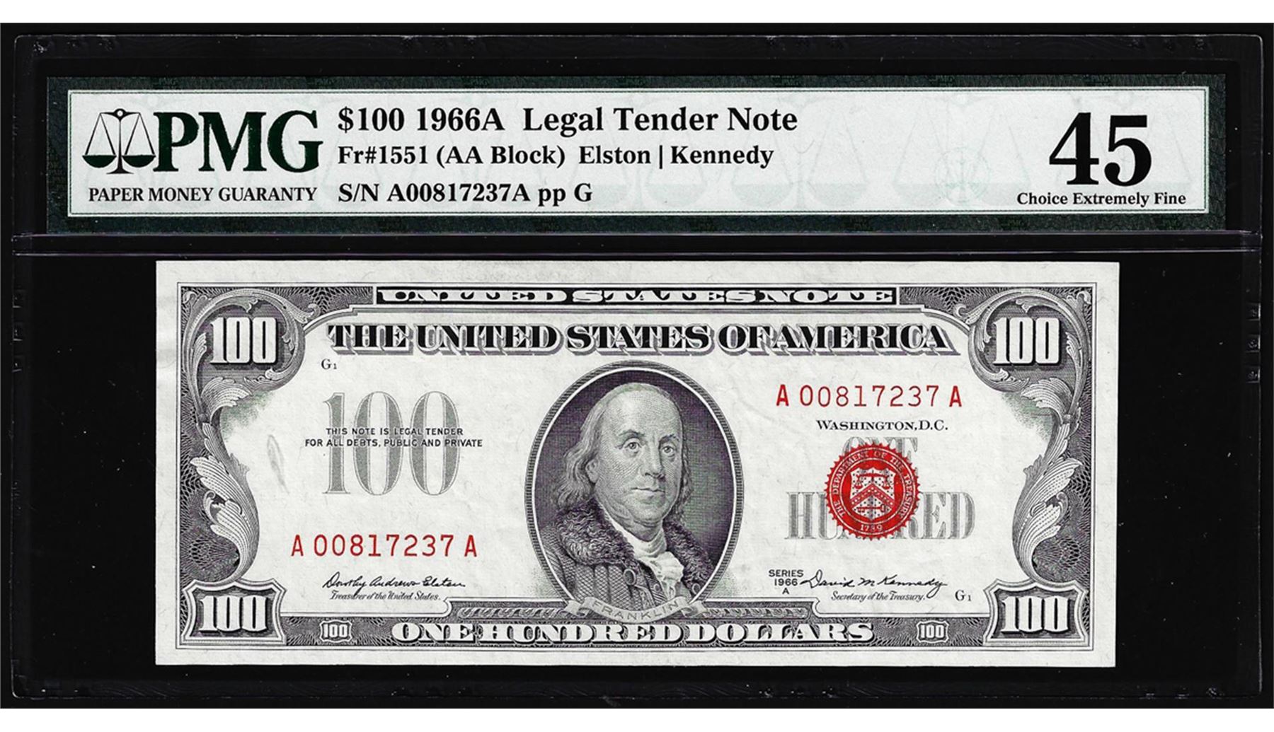 One 1966A $100 Legal Tender Note Fr.1551 PMG Choice Extremely Fine 45. PMG Certified.