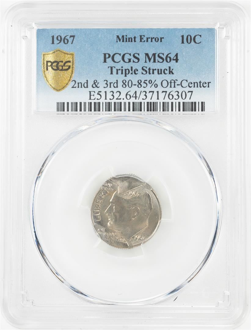 One 1967 Roosevelt Dime Coin Triple Struck Off Center ERROR PCGS MS64. PCGS Graded.