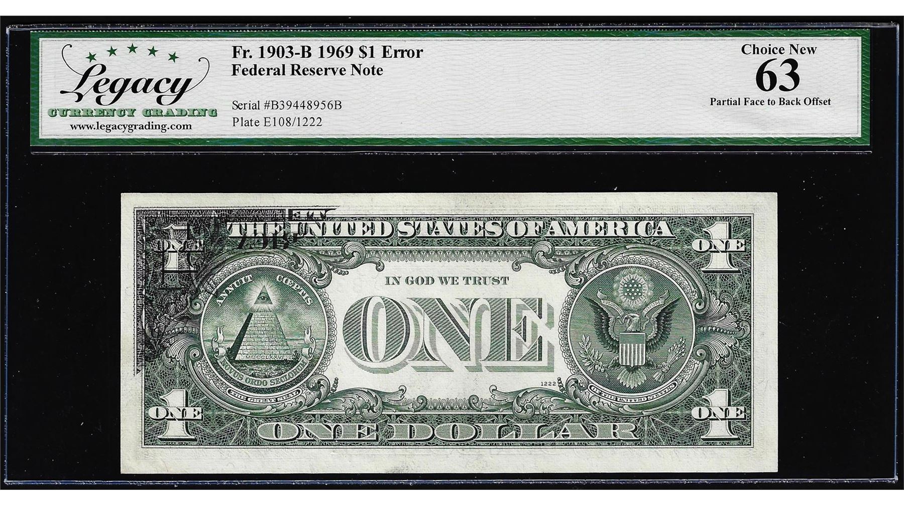 One 1969 $1 Federal Reserve Note Partial Face to Back Offset Error Legacy Choice New 63. Legacy Graded.
