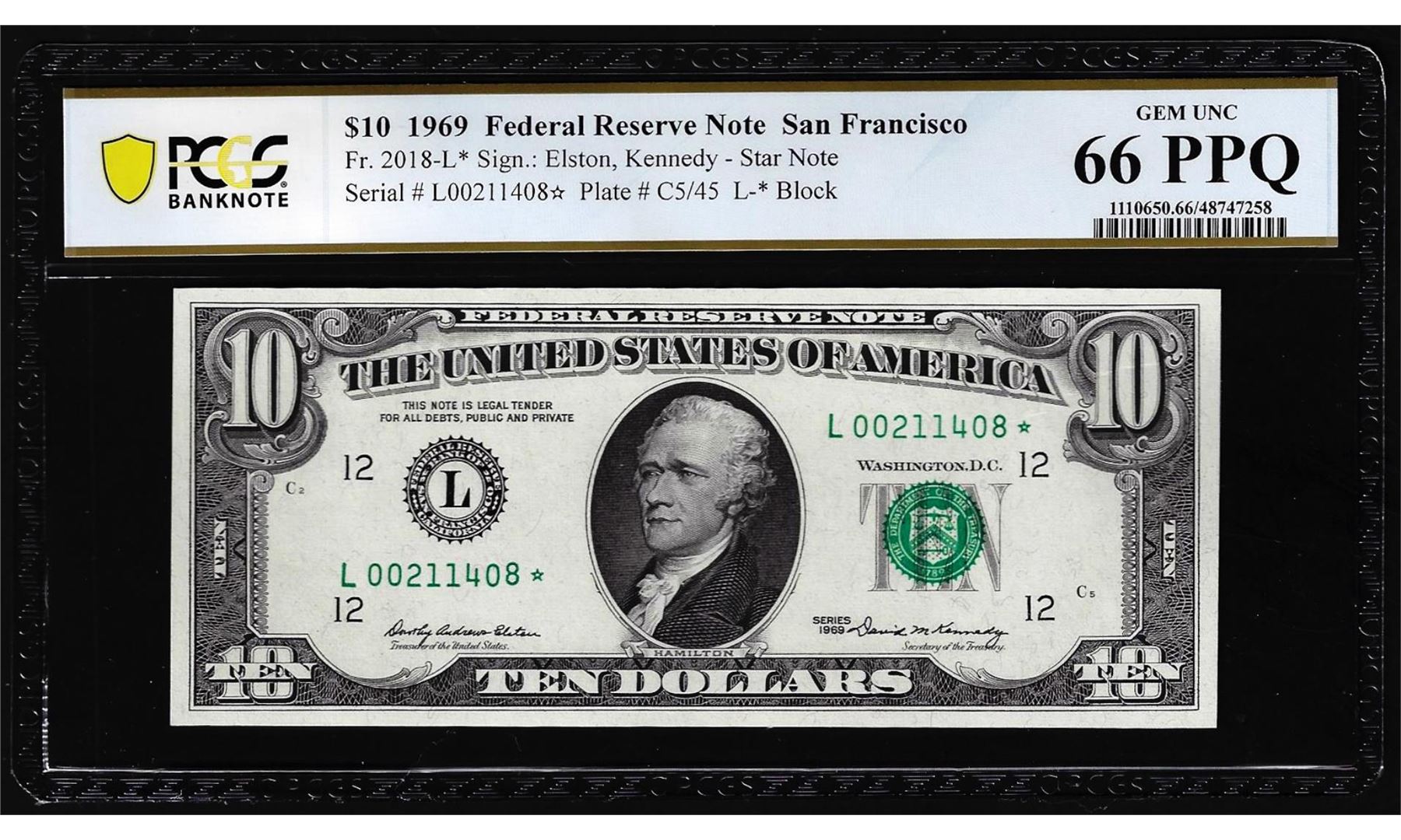 1969 $10 Federal Reserve STAR Note Fr.2018-L* PCGS Gem Uncirculated 66PPQ