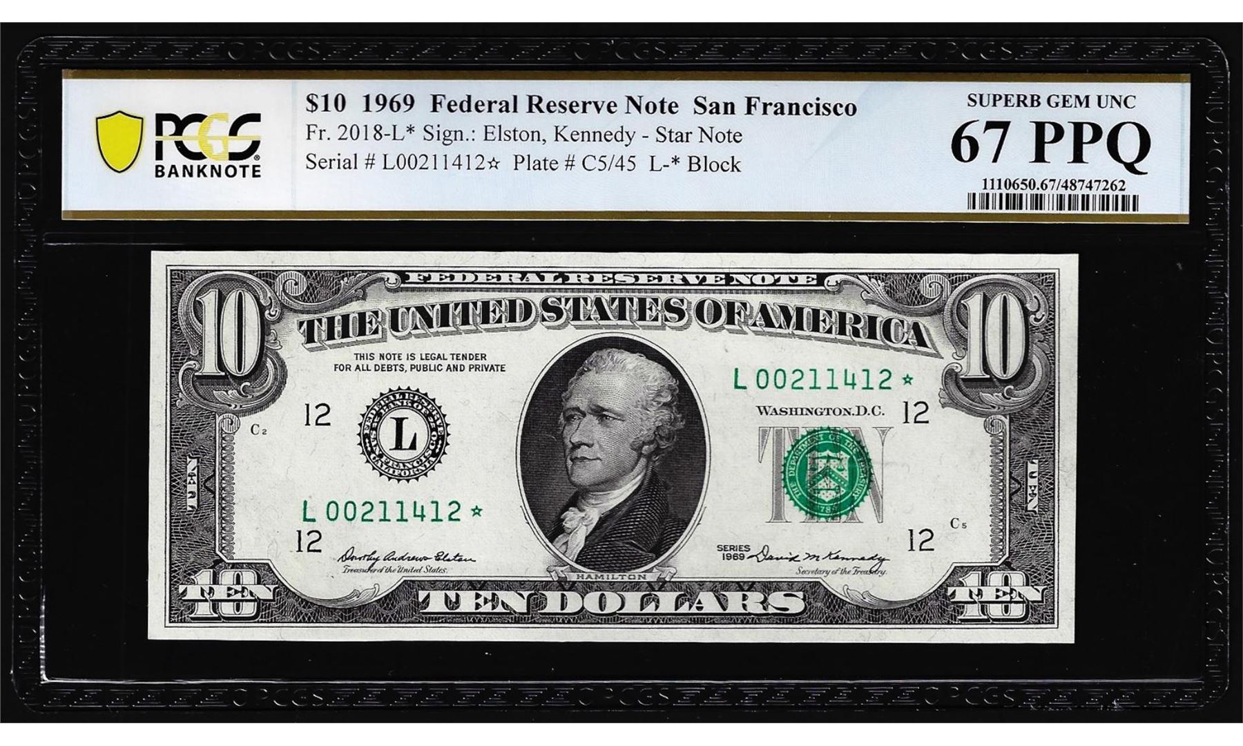 One 1969 $10 Federal Reserve STAR Note Fr.2018-L* PCGS Superb Gem Unc 67PPQ Top Pop. PCGS Graded.