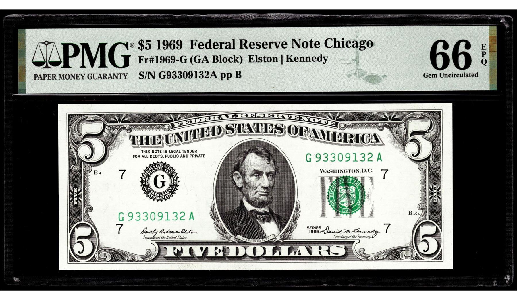 One 1969 $5 Federal Reserve Note Chicago Fr.1969-G PMG Gem Uncirculated 66EPQ. PMG Certified.