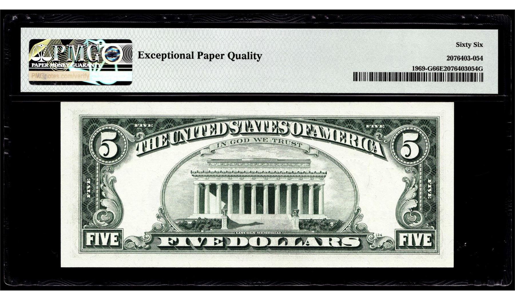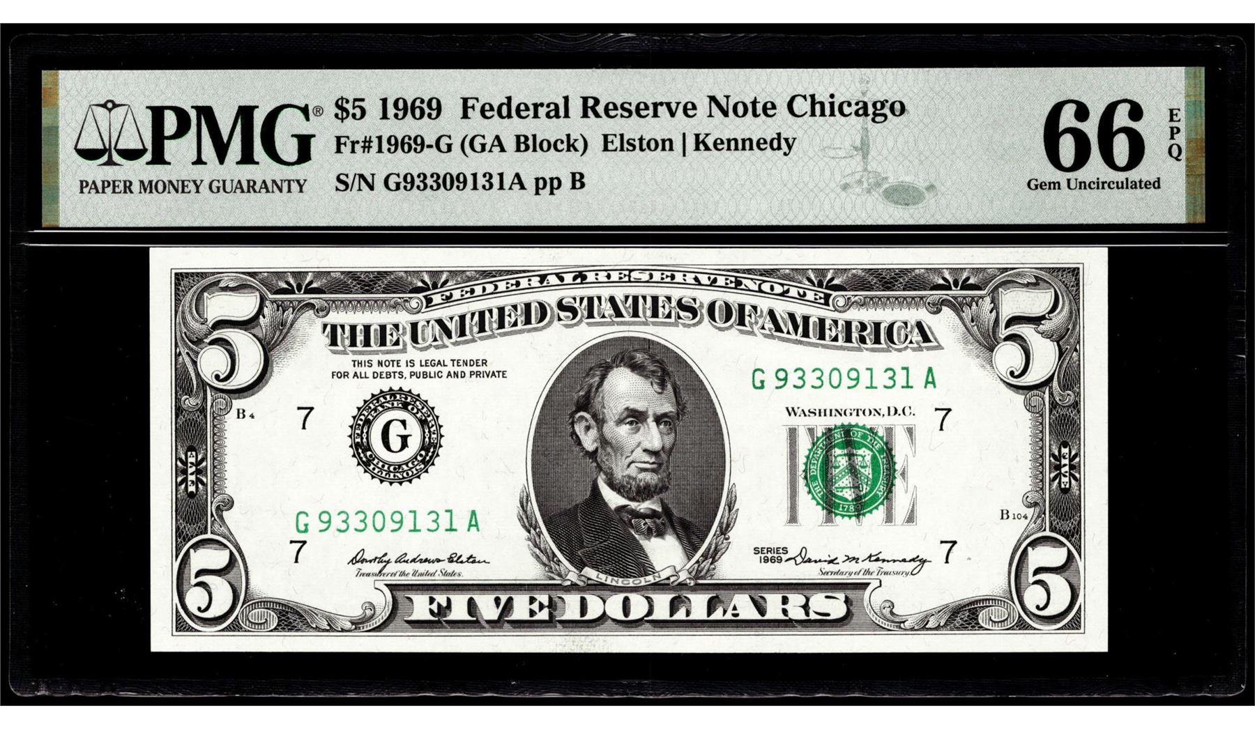 One 1969 $5 Federal Reserve Note Chicago Fr.1969-G PMG Gem Uncirculated 66EPQ. PMG Certified.