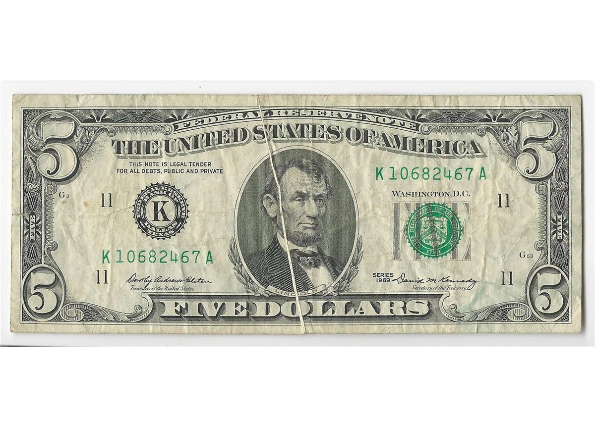 One 1969 $5 Federal Reserve Note Gutterfold ERROR.