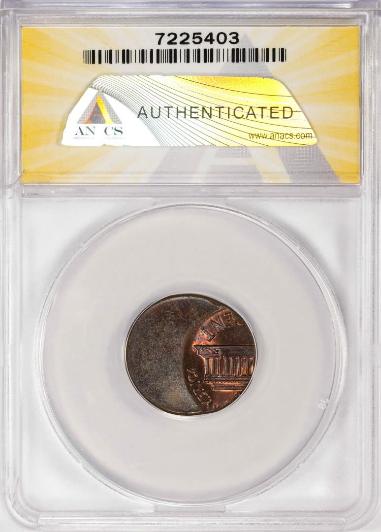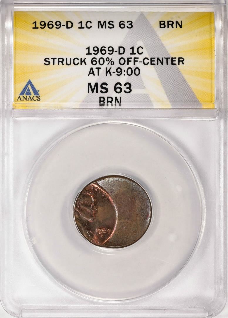 One 1969-D Lincoln Cent Coin Mint Error Struck 60% Off-Center @ 9:00 ANACS MS63BN. ANACS Certified.