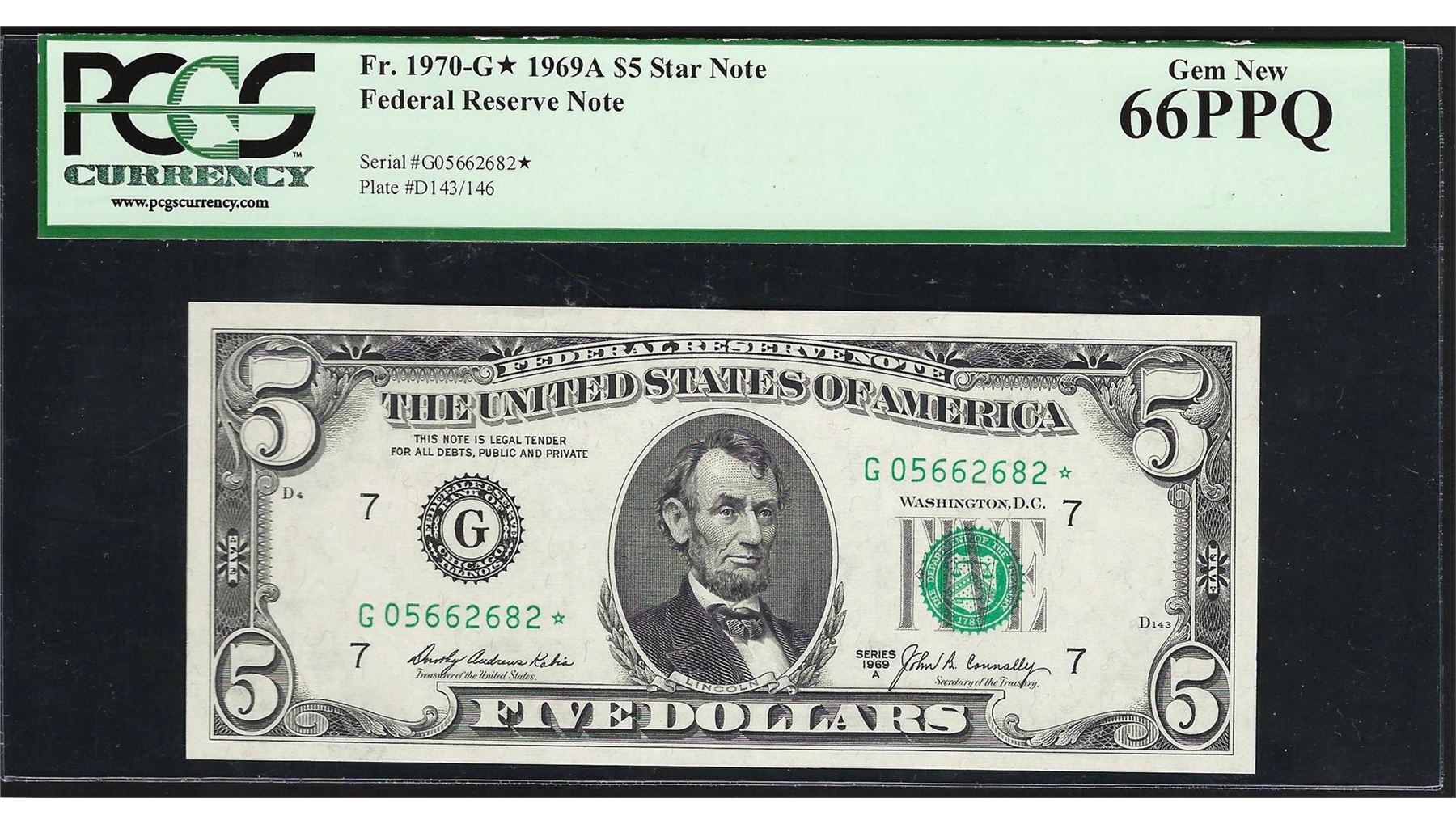 1969A $5 Federal Reserve STAR Note Fr.1970-G* PCGS Gem New 66PPQ