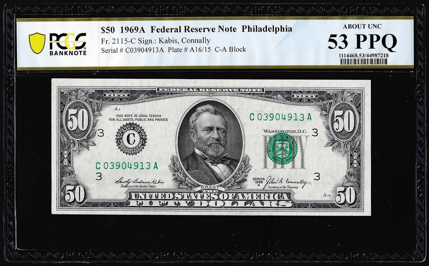 One 1969A $50 Federal Reserve Note Philadelphia Fr.2115-C PCGS About Uncirculated 53PPQ. PCGS Graded.