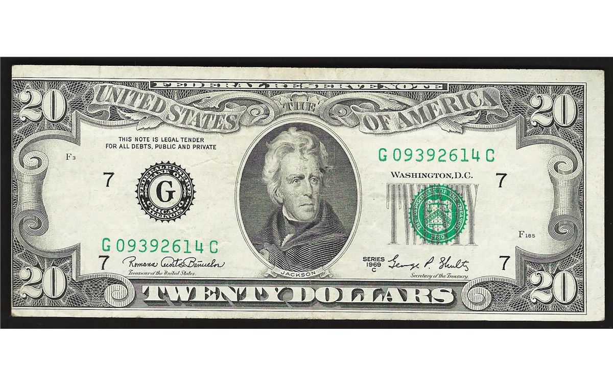 One 1969C $20 Federal Reserve Note ERROR Faulty Alignment.