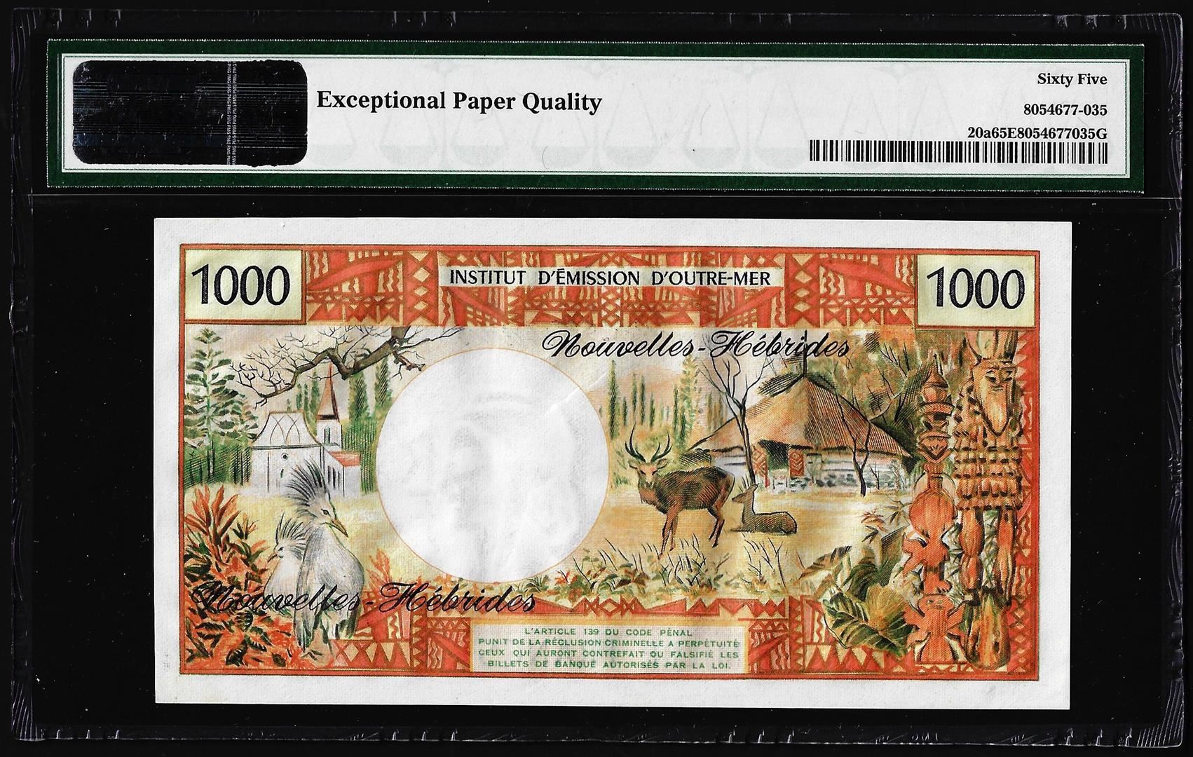 One 1970 New Hebrides Institut D Emission D Outre-Mer 1000 Francs Note Pick# 20a PMG Gem Uncirculated 65EPQ. PMG Certified.