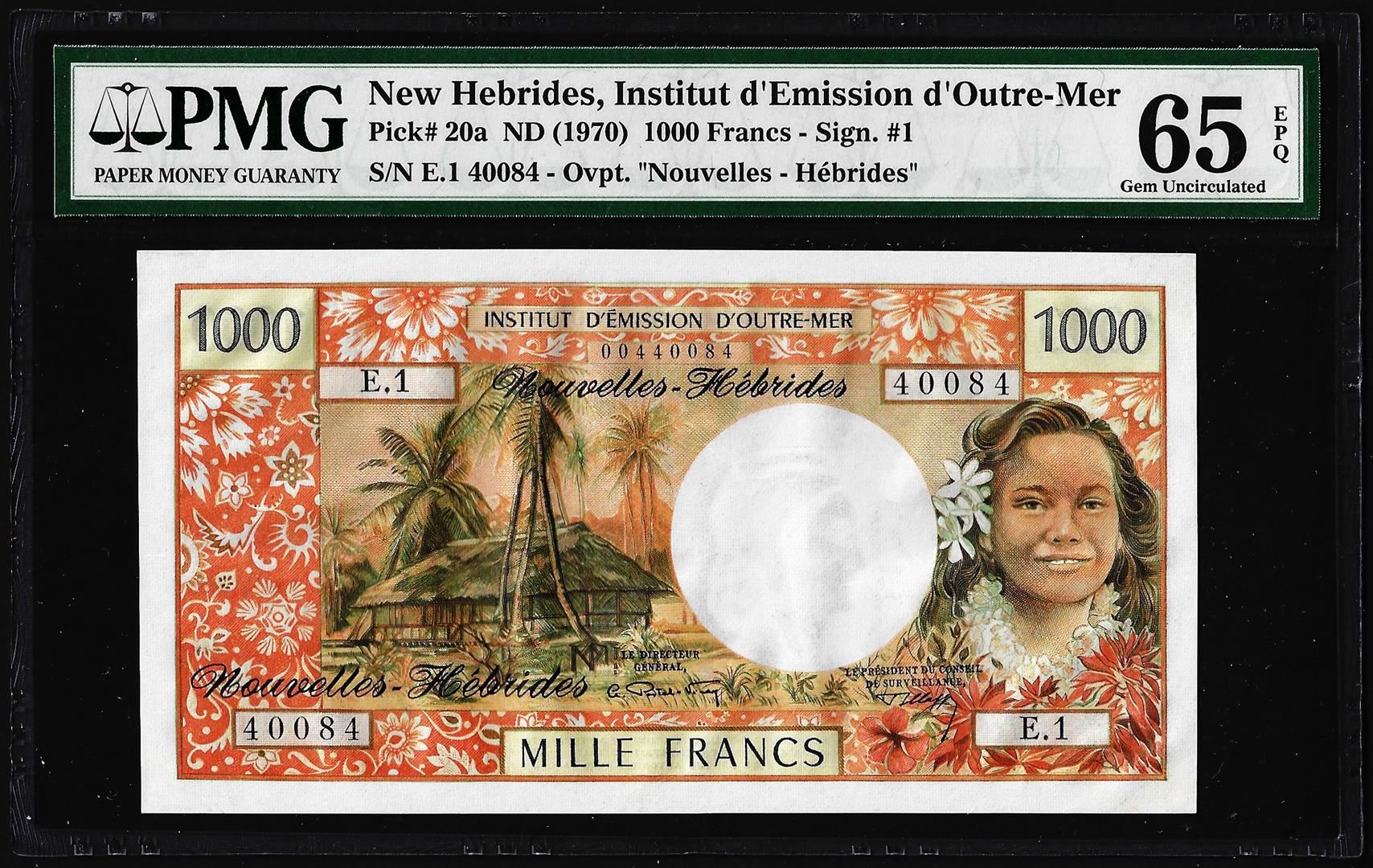 One 1970 New Hebrides Institut D Emission D Outre-Mer 1000 Francs Note Pick# 20a PMG Gem Uncirculated 65EPQ. PMG Certified.