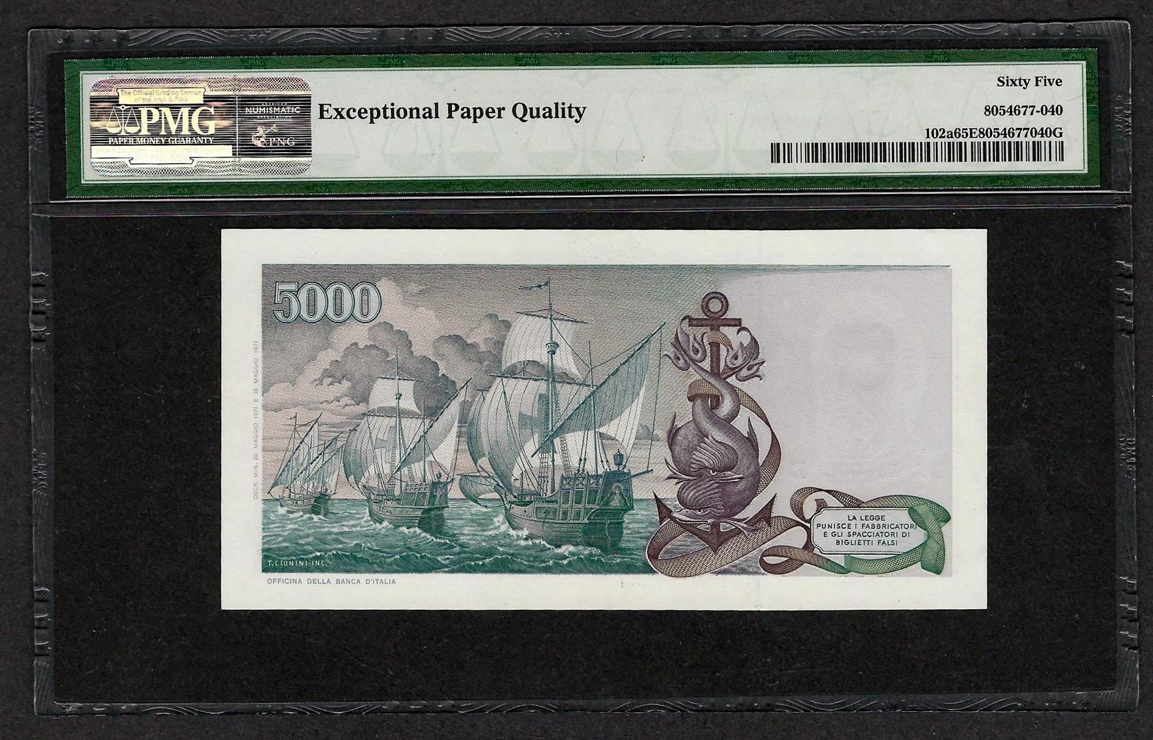 One 1971 Banca d'Italia Italy 5000 Lire Note Pick# 102a PMG Gem Uncirculated 65EPQ. PMG Certified.