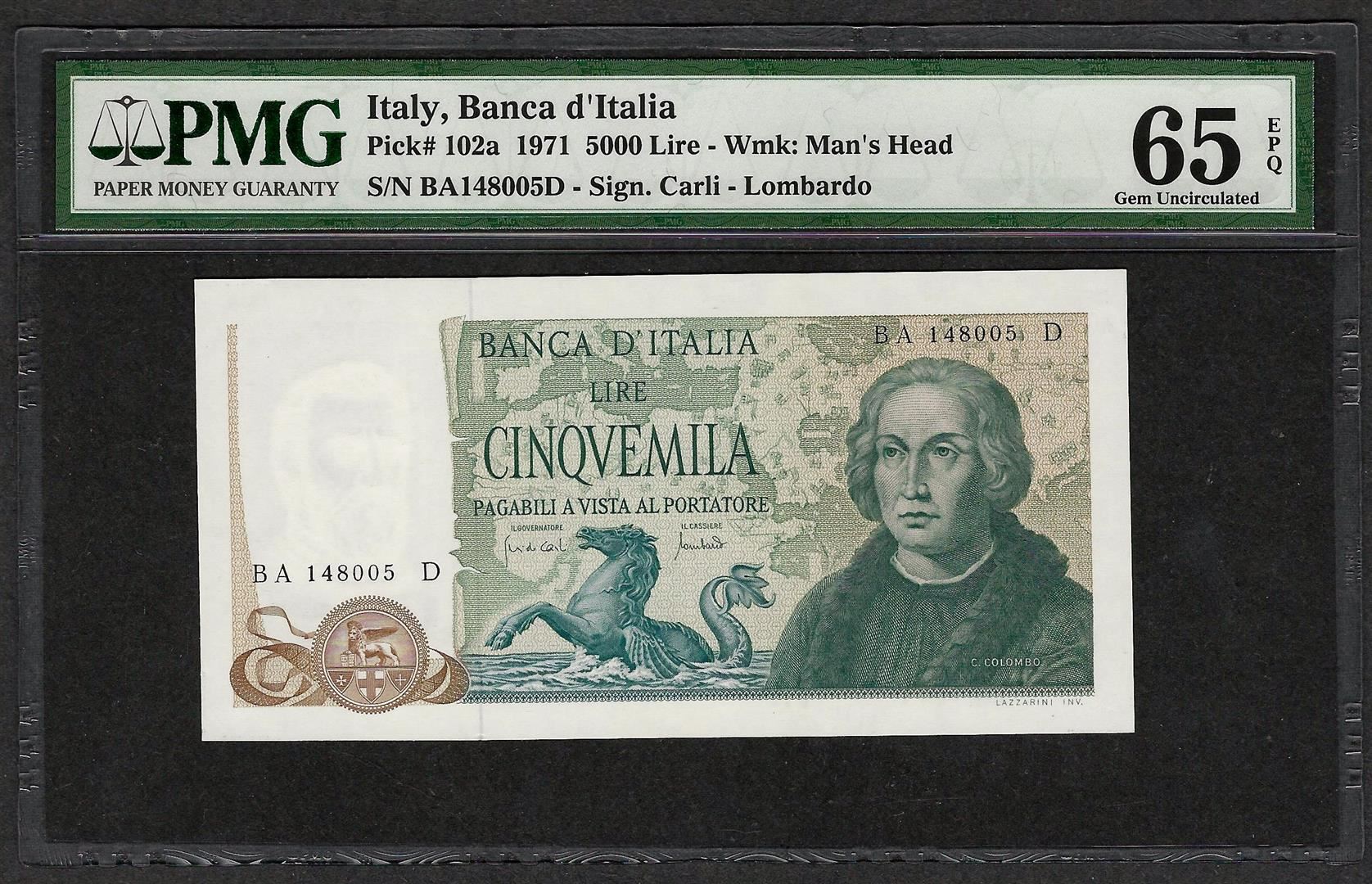 One 1971 Banca d'Italia Italy 5000 Lire Note Pick# 102a PMG Gem Uncirculated 65EPQ. PMG Certified.