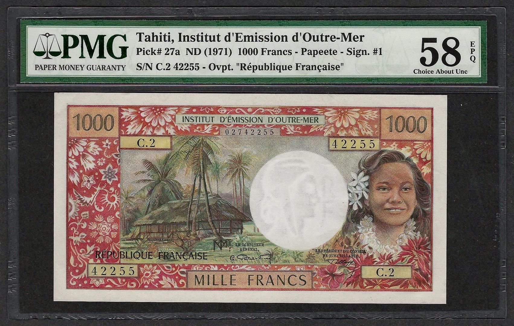 One 1971 Institut d'Edmission Tahiti 1000 Francs Note Pick 27a PMG Choice About Unc 58EPQ. PMG Certified.