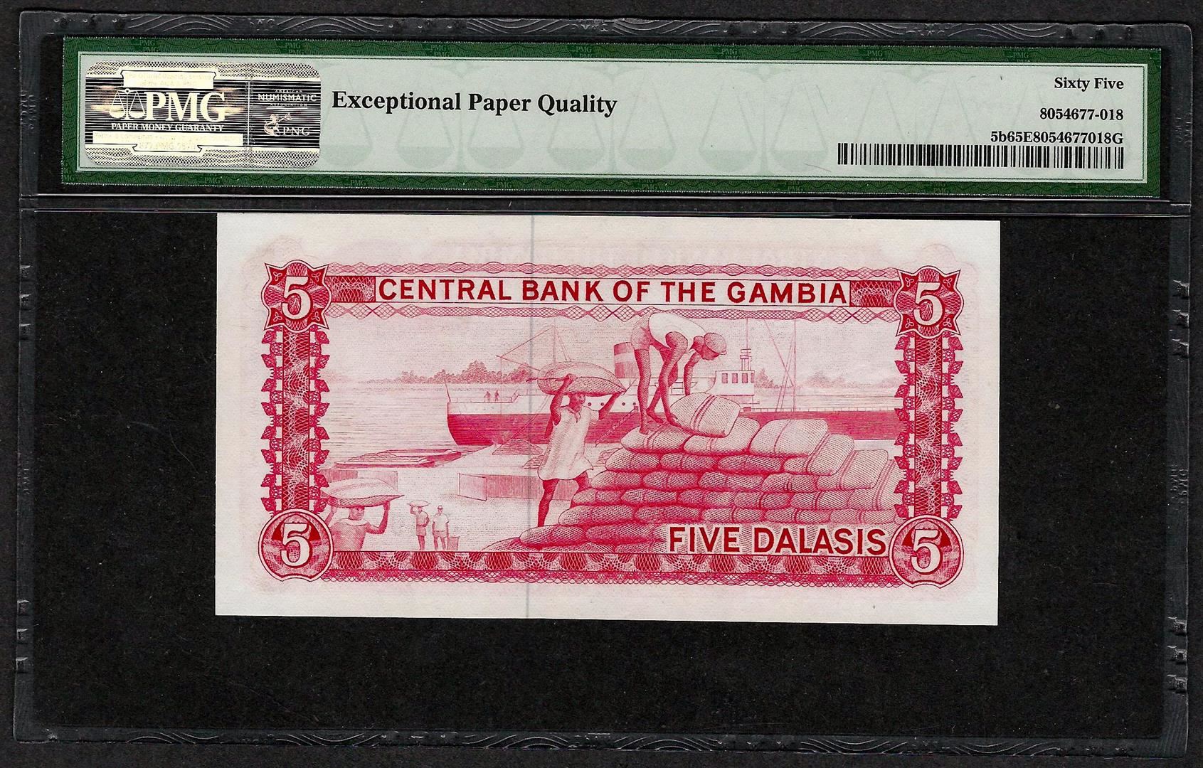 One 1972-86 Central Bank Gambia 5 Dalasis Note Pick# 5b PMG Gem Uncirculated 65EPQ. PMG Certified.