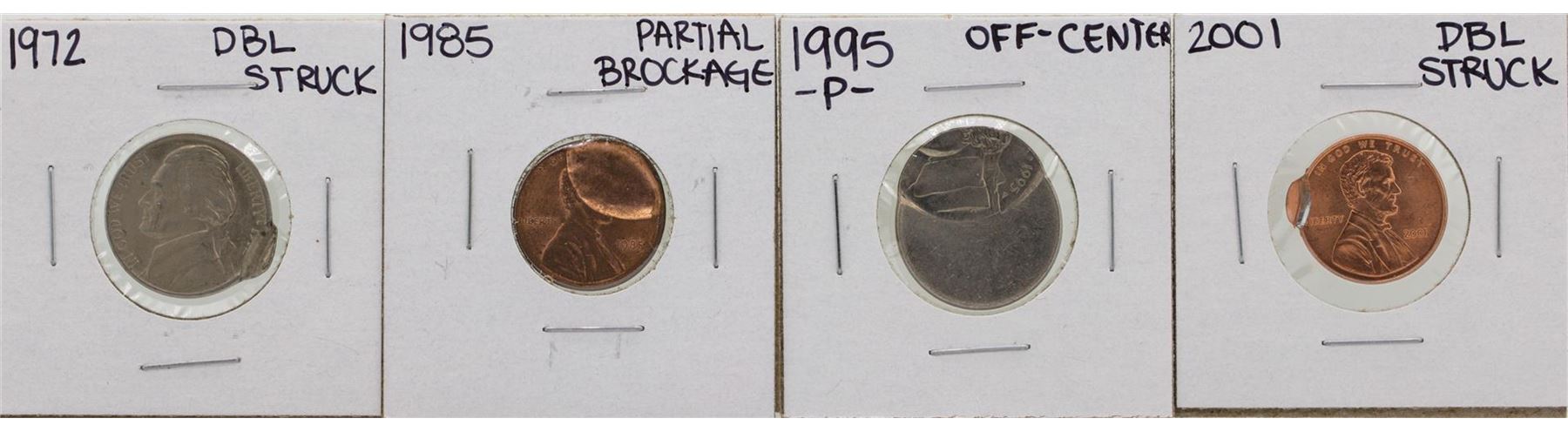 1972 Double Struck Cent & Nickel, 1985 Brockage Penny & 1995-P Off Center Nickel